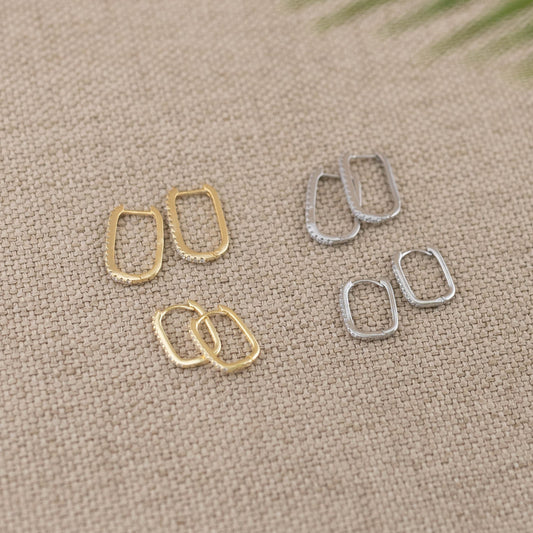 Pave rectangle earrings, long rectangular pave hoops, oblong square hoops, sterling silver small hoop, stacking earring, geometric gold hoop