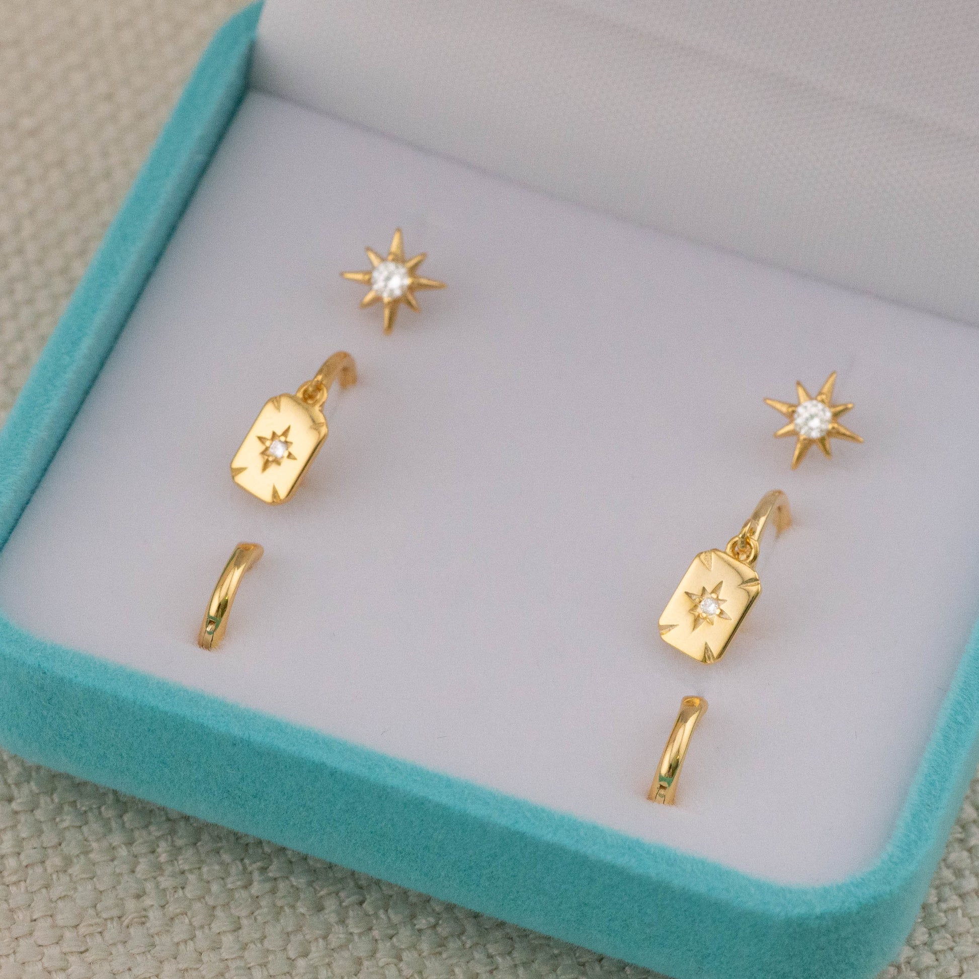 Shine Bright with our Celestial Earrings Gift Set! This handpicked collection features star studs, huggie earrings with charm, and small, simple huggies perfect for second piercings or cartilage accents. Whether you choose a set of two or three, our matching-gift-sets ensure a celestial sparkle that's as unique as you are!