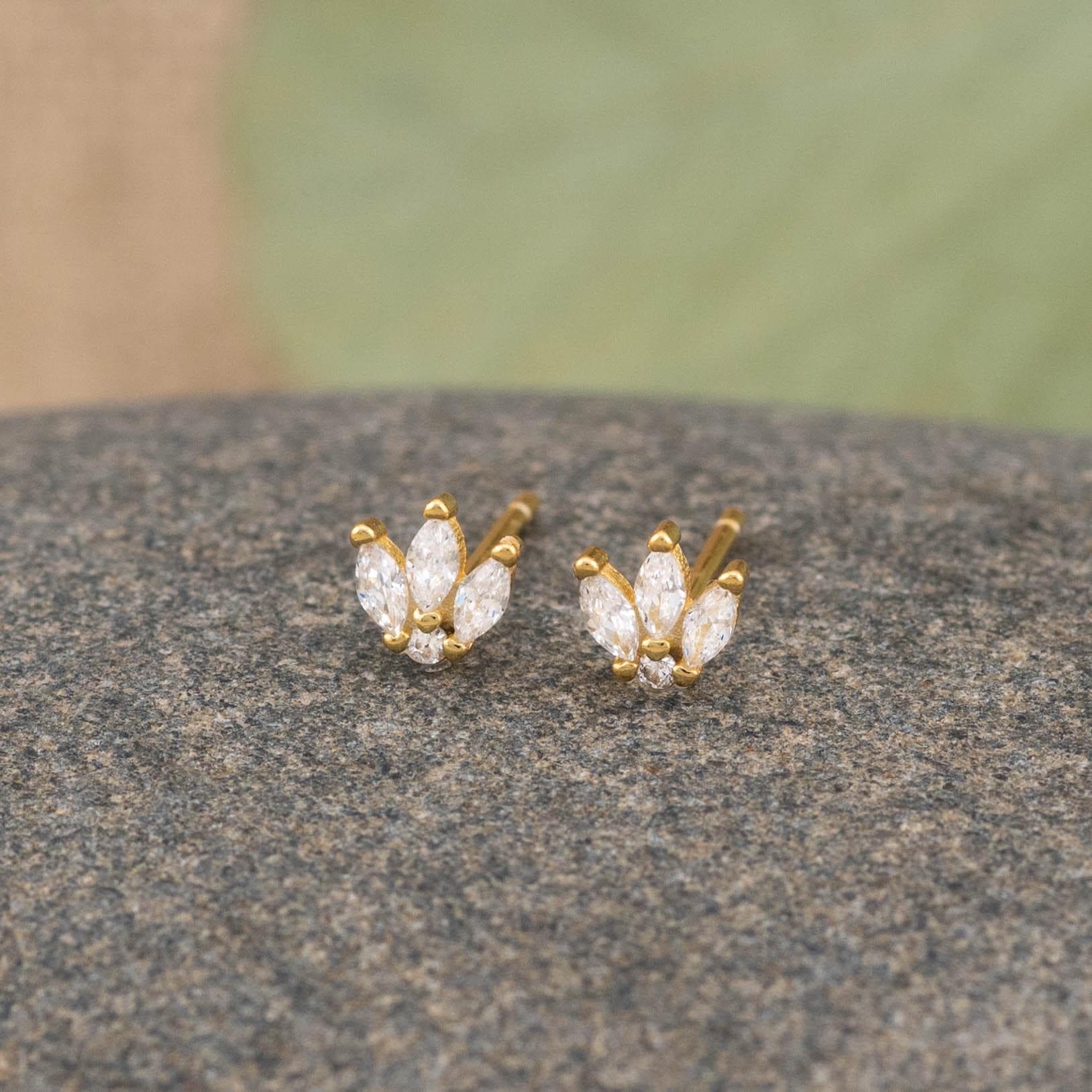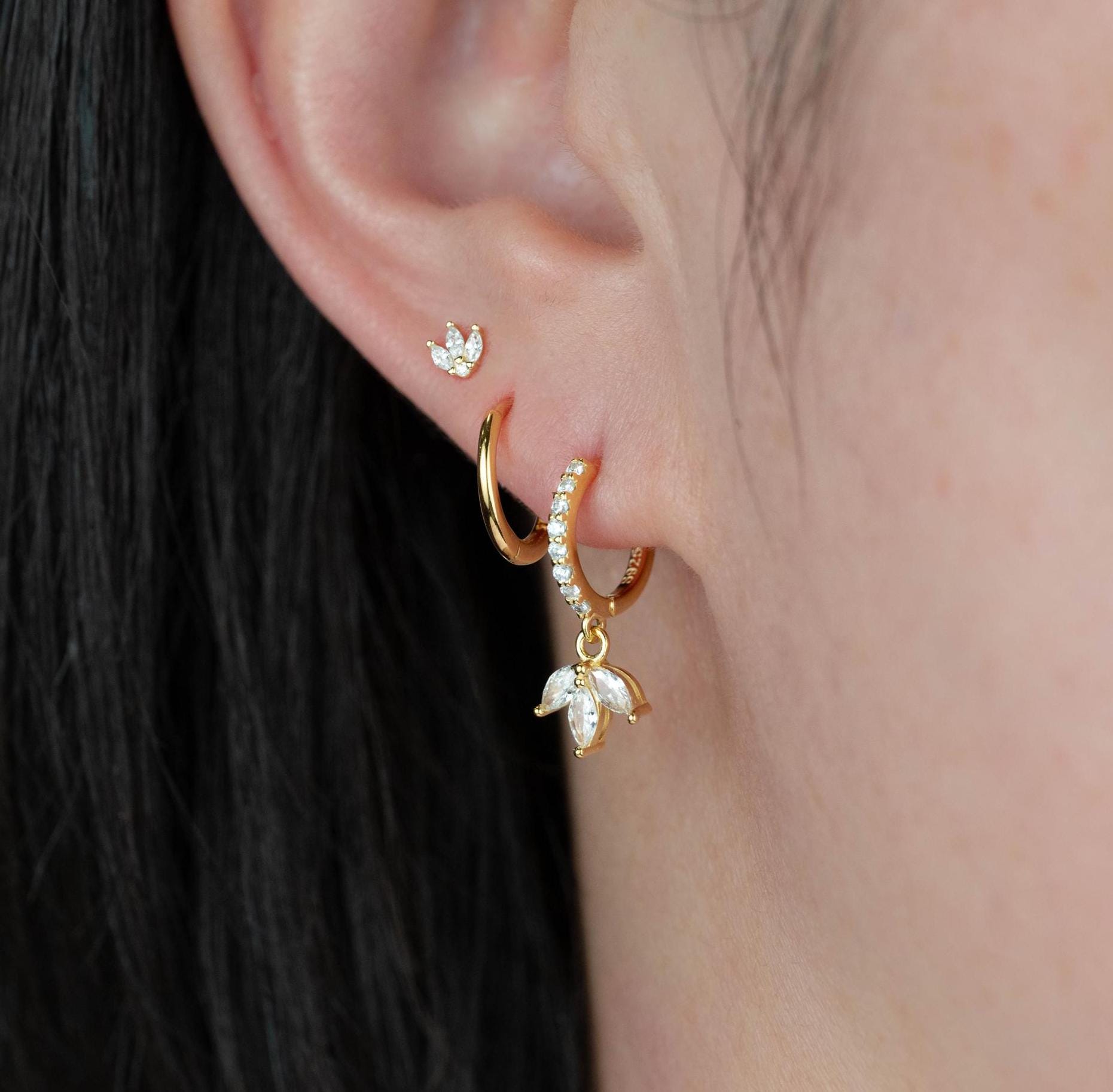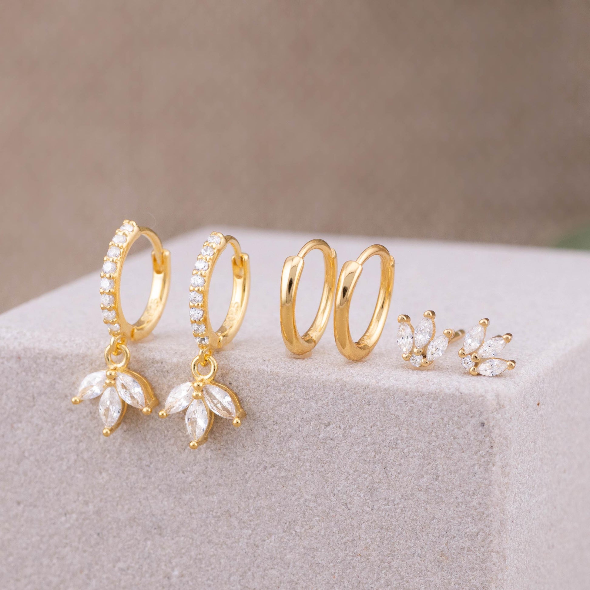 The earring stack set designed to mix and match. This set of 2 or 3 pairs features a marquise-cut small diamond huggie hoop, a tiny gold CZ pave huggie hoop, and a delicate marquise lotus flower stud—perfect for stacking on your lobe, second hole, or cartilage. Crafted in 14K gold fill, they’re lightweight, hypoallergenic, and made for all-day wear.