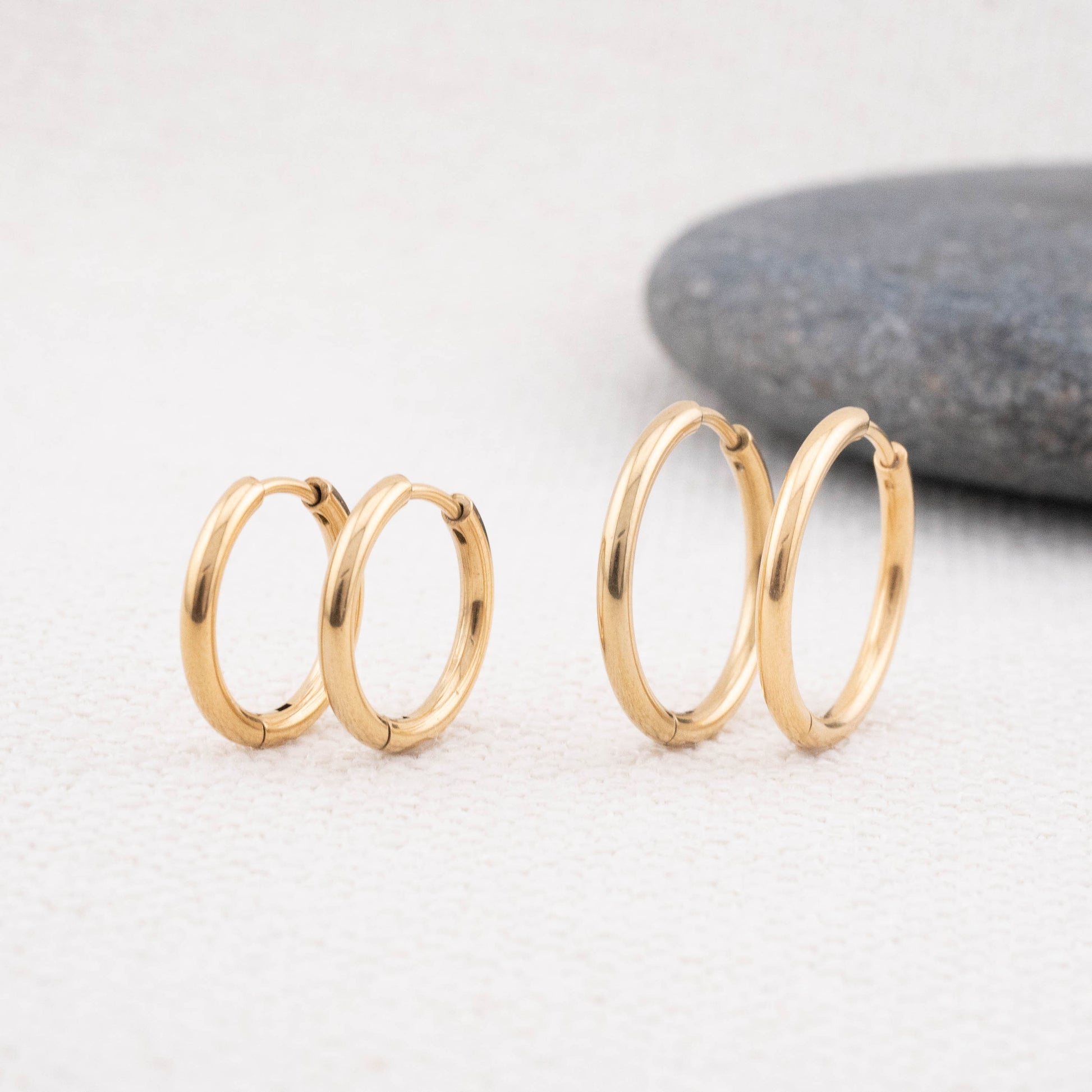 Our small huggie hoop earrings set of 3 pairs in variety of sizes is here! They are dainty but durable, perfect for layering in stacks, and their chucky thick shape make them stand out. Their small or medium size makes them easy to style. Also their comfortable fit makes them a great choice for everyday wear and even sleep in them. These small huggie hoops are 14 K gold filled, hypoallergenic, tarnish free and waterproof !