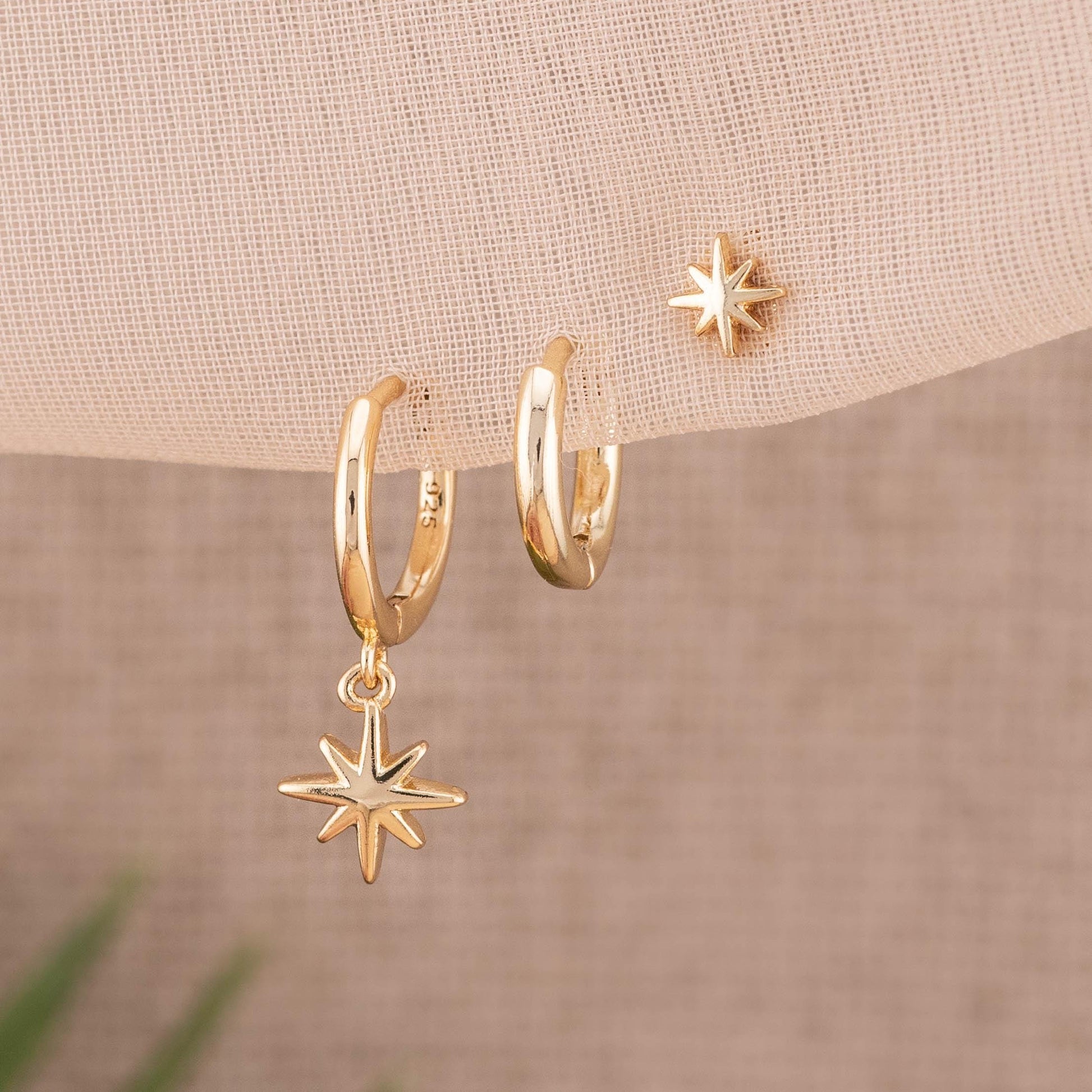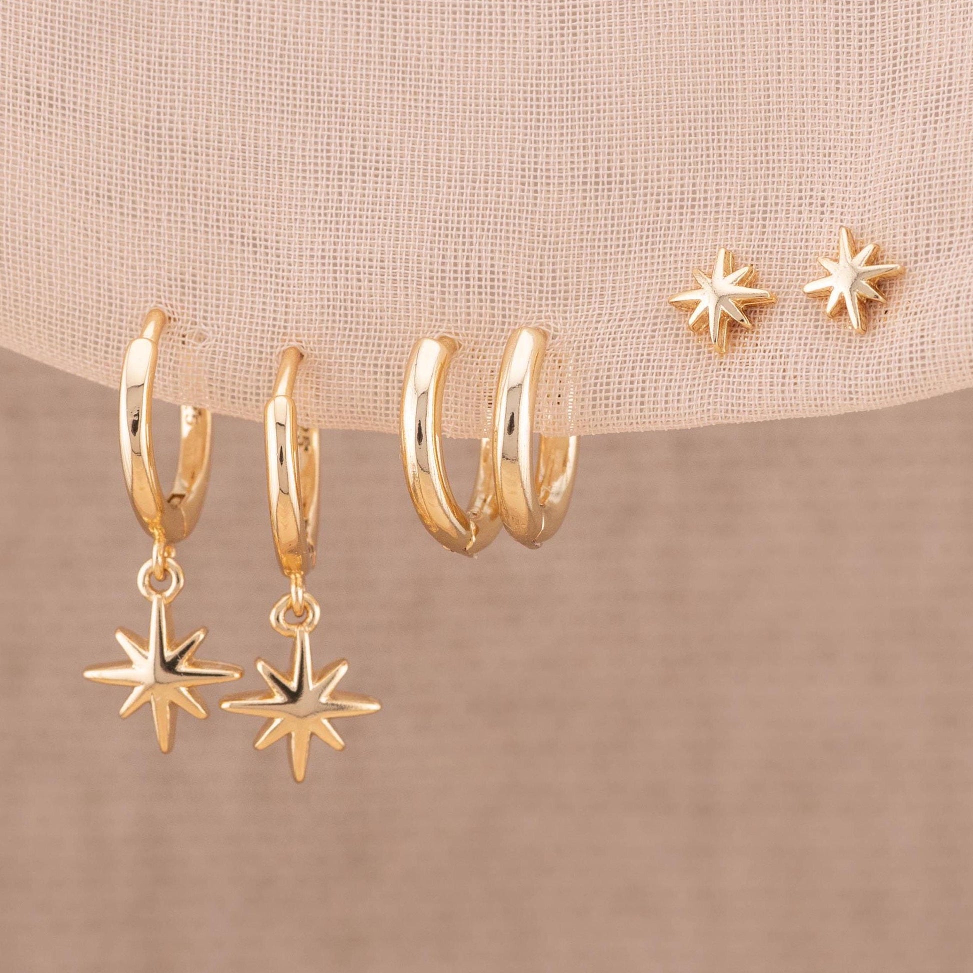 A little glow, every day. This set of 2 or 3 pairs features small 14K gold-filled huggie hoops and tiny star studs—perfect for stacking on your lobe or cartilage. Lightweight, non-tarnish, and hypoallergenic, they’re designed to shine in your everyday ear stack.