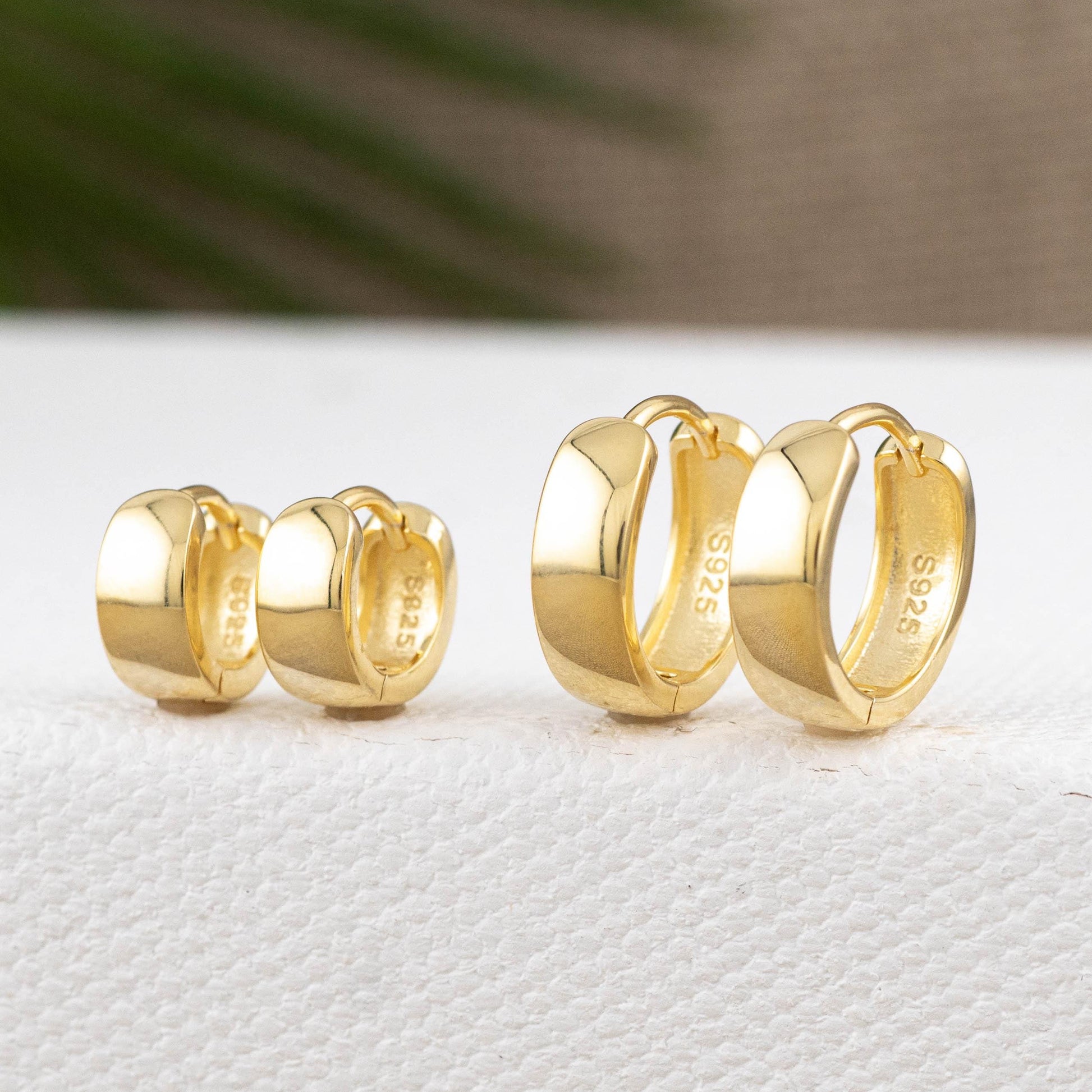 Bold in shape, minimal in size. These wide small huggie hoops add just the right touch of shine to any ear stack. Crafted in 14K gold fill with a secure clicker hinge closure, they’re lightweight, durable, and designed for everyday wear.