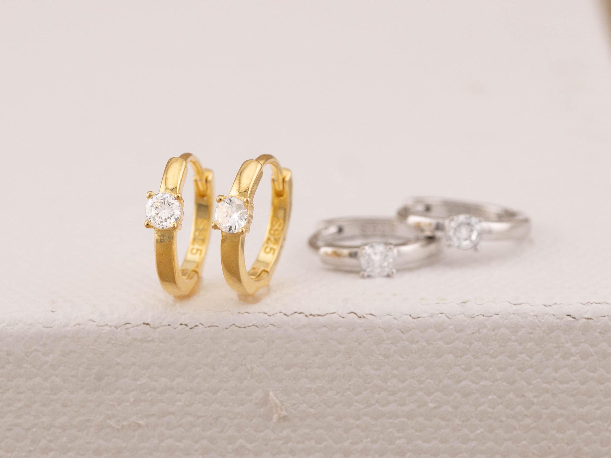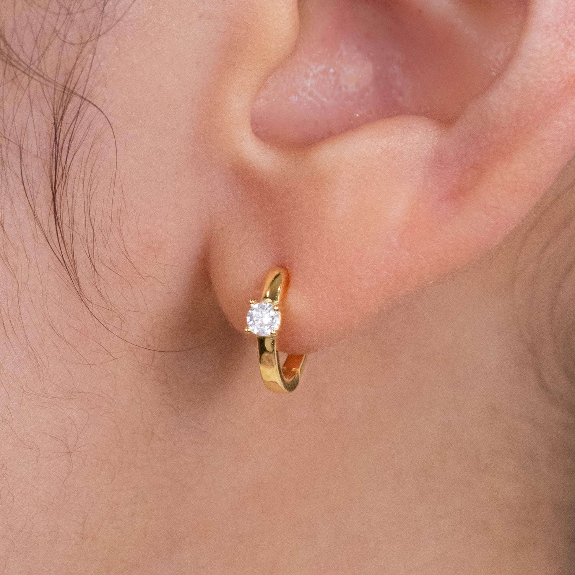 14K Gold Vermeil or Solid Sterling Silver 925 Huggie Hoop Earrings with High-Quality Diamond CZ Stones to add a classic touch to your outfit. These 9mm tiny hoops feature a hinged clicker design for easy wear and are ideal for stacking, allowing you to mix and match for a personalized style.