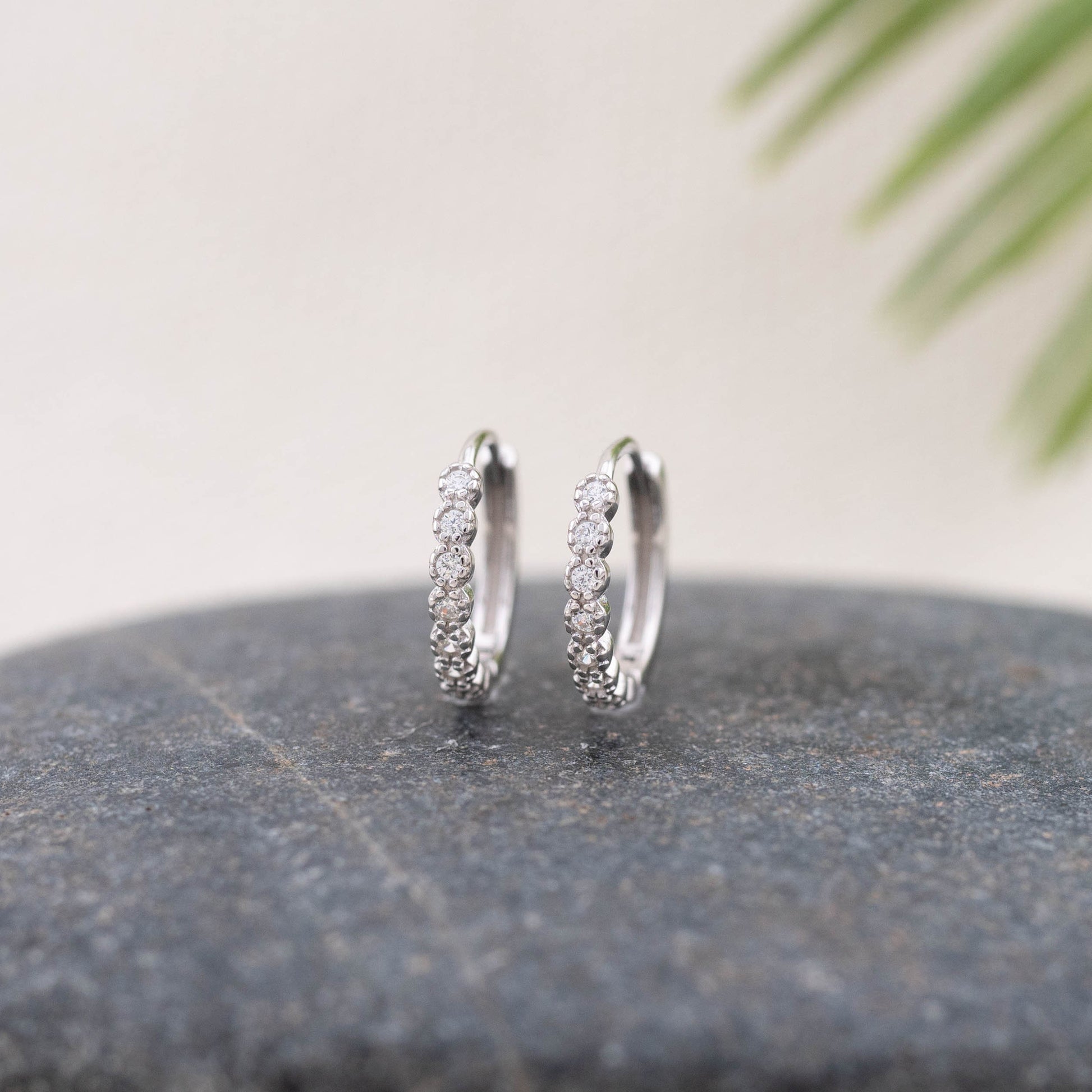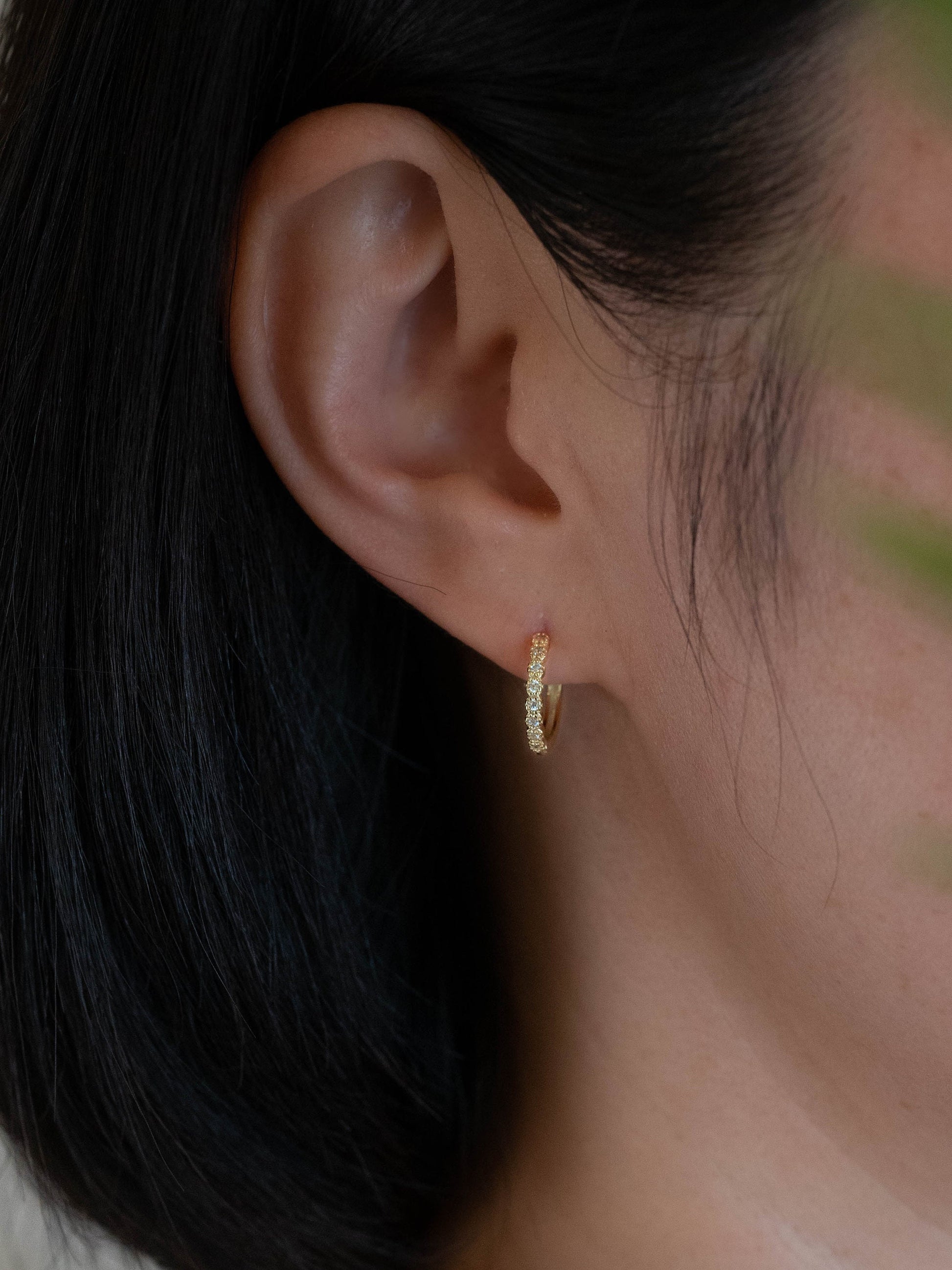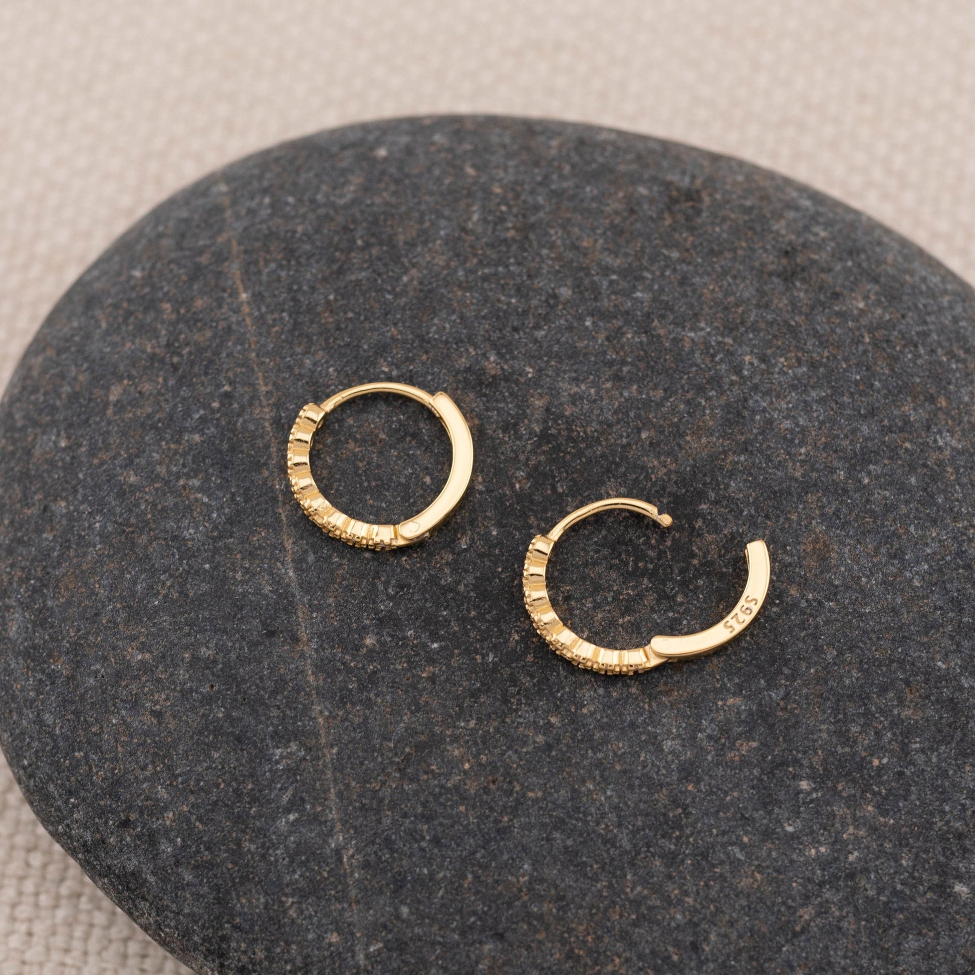 Solid sterling silver 925 dainty huggie hoop earrings with premium diamond pave stones to finish your outfit. Finished with 18K gold fill or sterling silver. These minimalistic tiny hoop earrings are a timeless addition to any outfit.