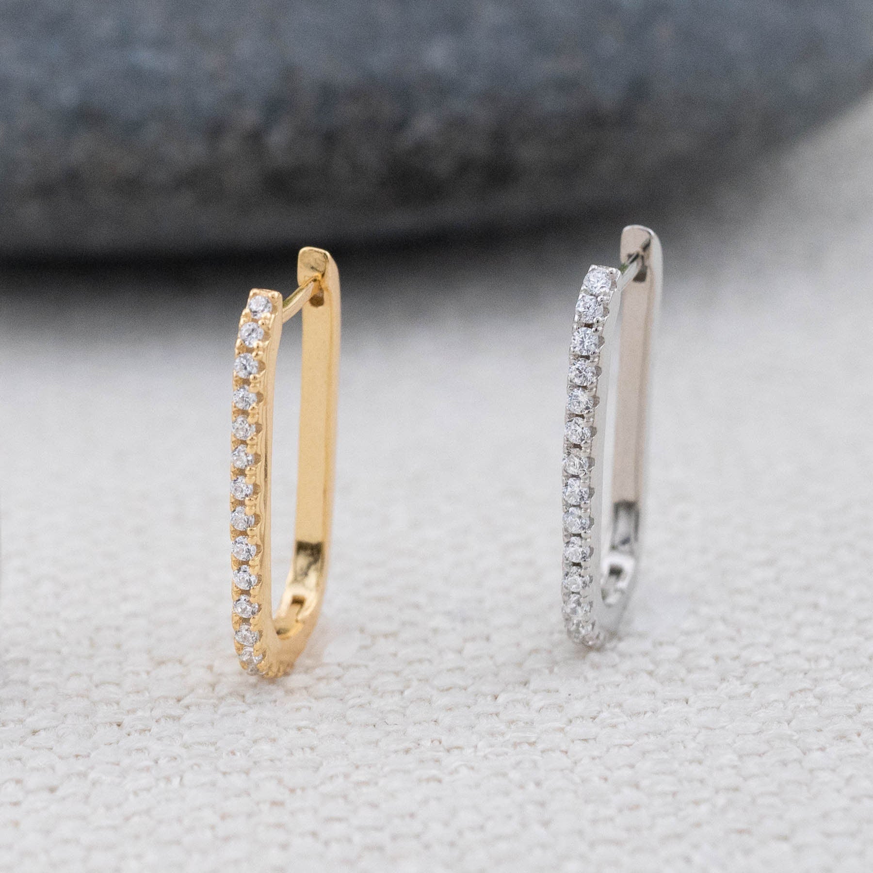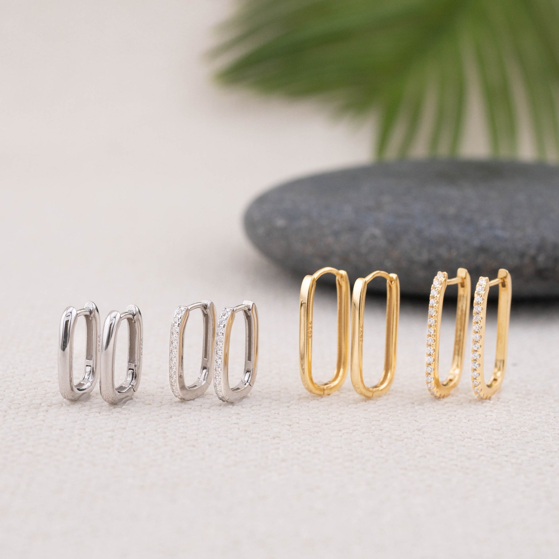 Introducing our simple, modern, rectangular stacking hoop set for everyday wear - made of solid sterling silver and premium diamond cz. They are finished with a thick layer of platinum or 14K gold. They can be a versatile and trendy gift for your loved ones!