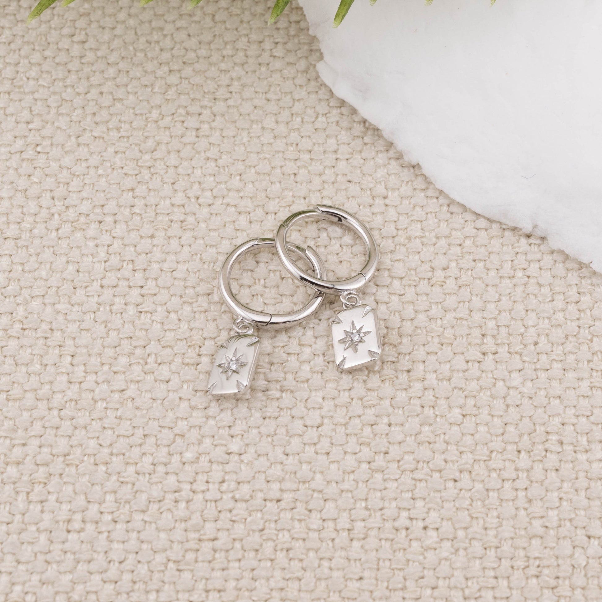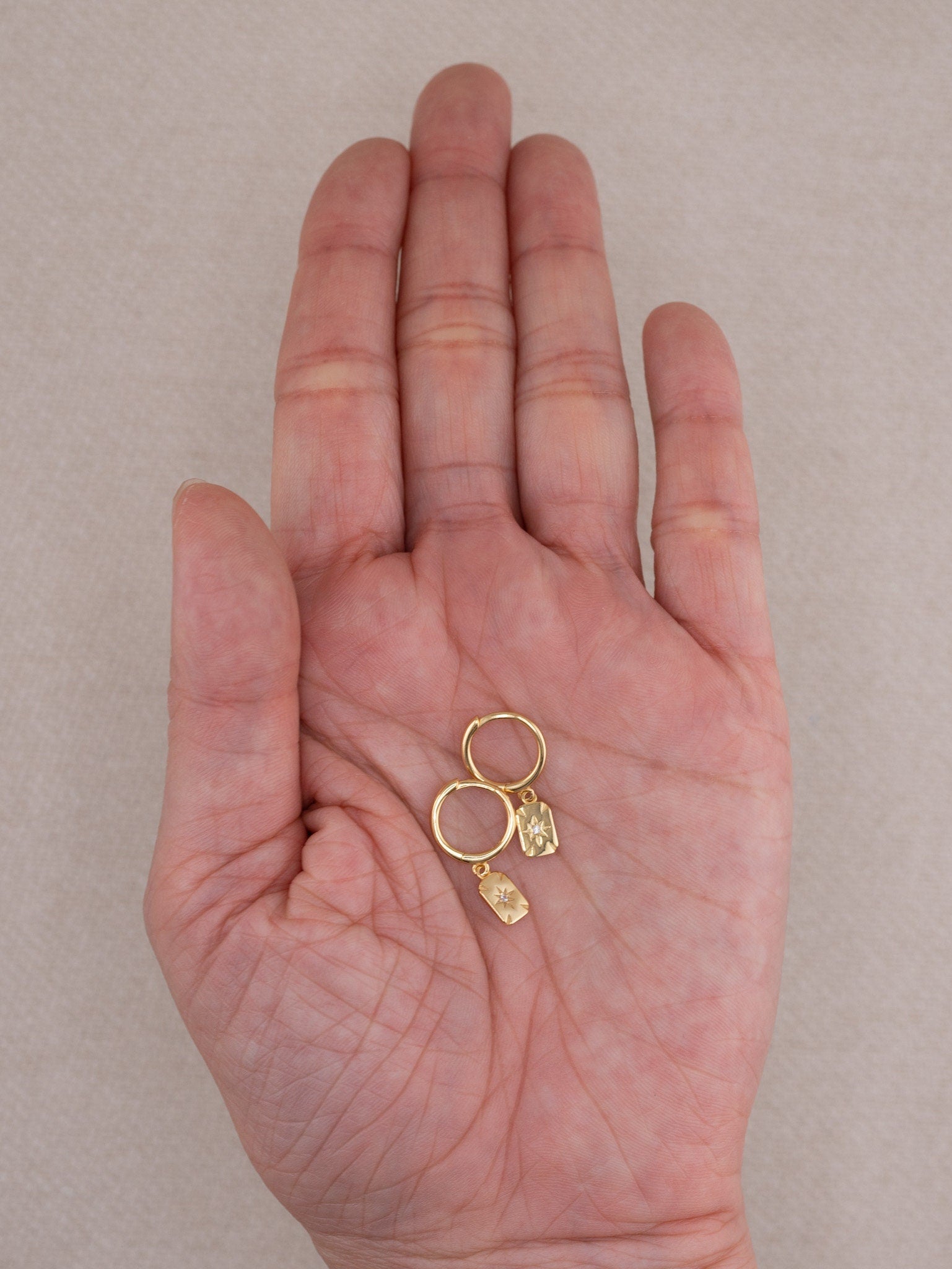 Introducing our gold huggie hoops with tiny celestial disk charm! They feature sun / starburst rectangular charm and are the perfect minimalist accessory to wear every day. The delicate and lightweight design will ensure you feel comfortable all day long. Made with high quality 925 sterling silver with 18 K gold filled finish.