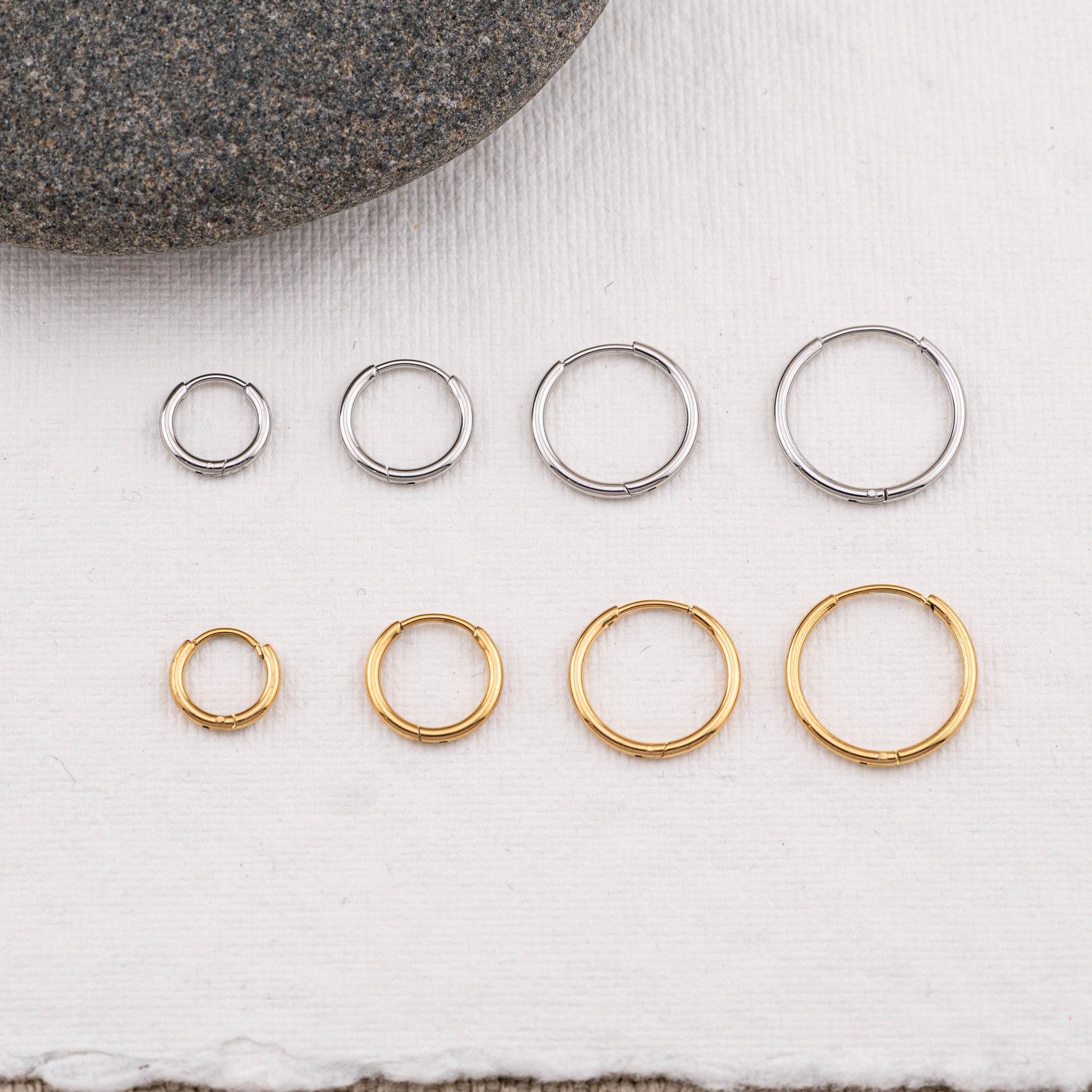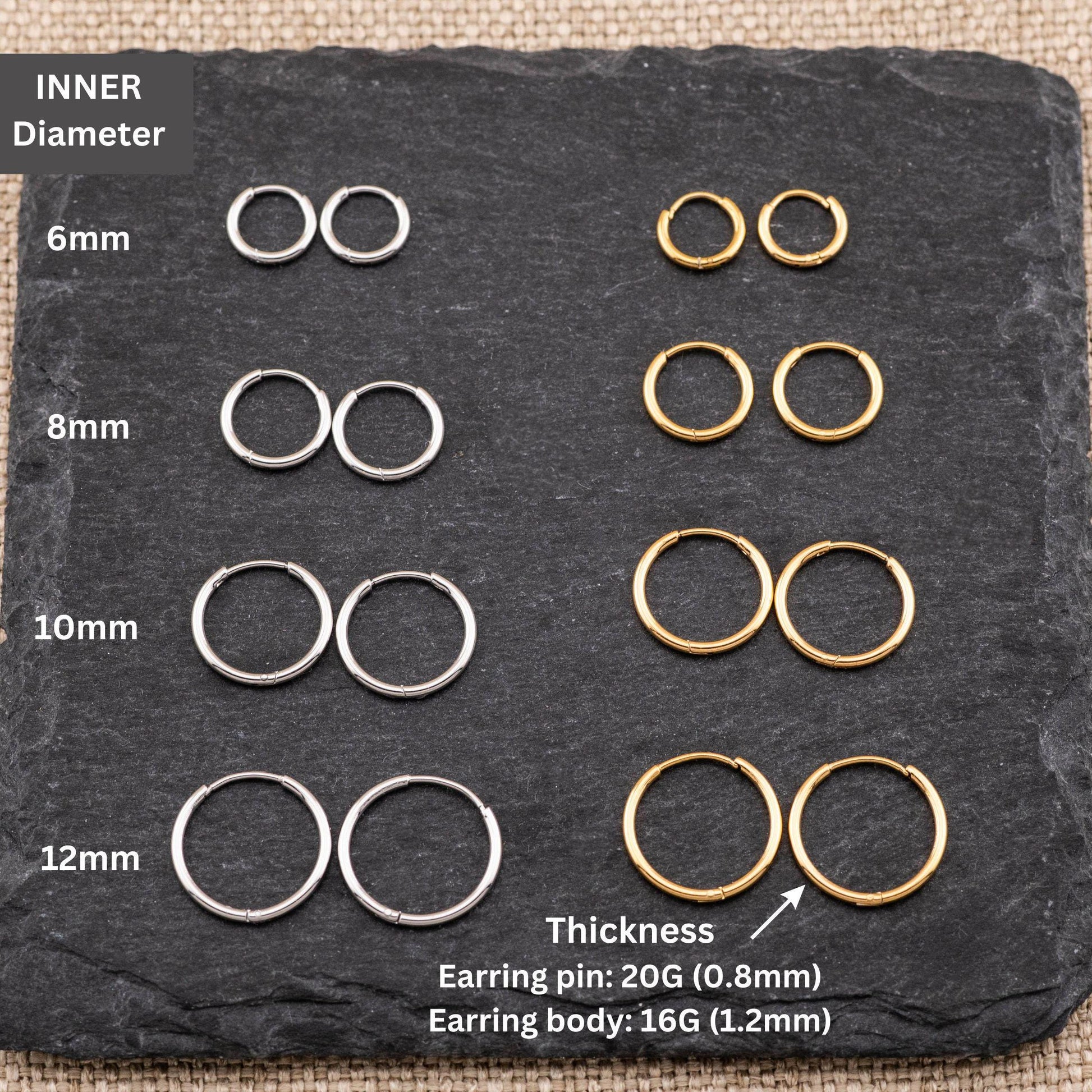 Our tiny small huggie hoop earrings are sold as 2 pairs, or 3 pairs gift ready sets! They are perfect as stacking hoop and their minimalistic thin design with hinged closure make it great for everyday wear! Made of premium quality titanium, silver finish, or 18K gold filled finish (core material titanium), hypoallergenic, tarnish free and waterproof !