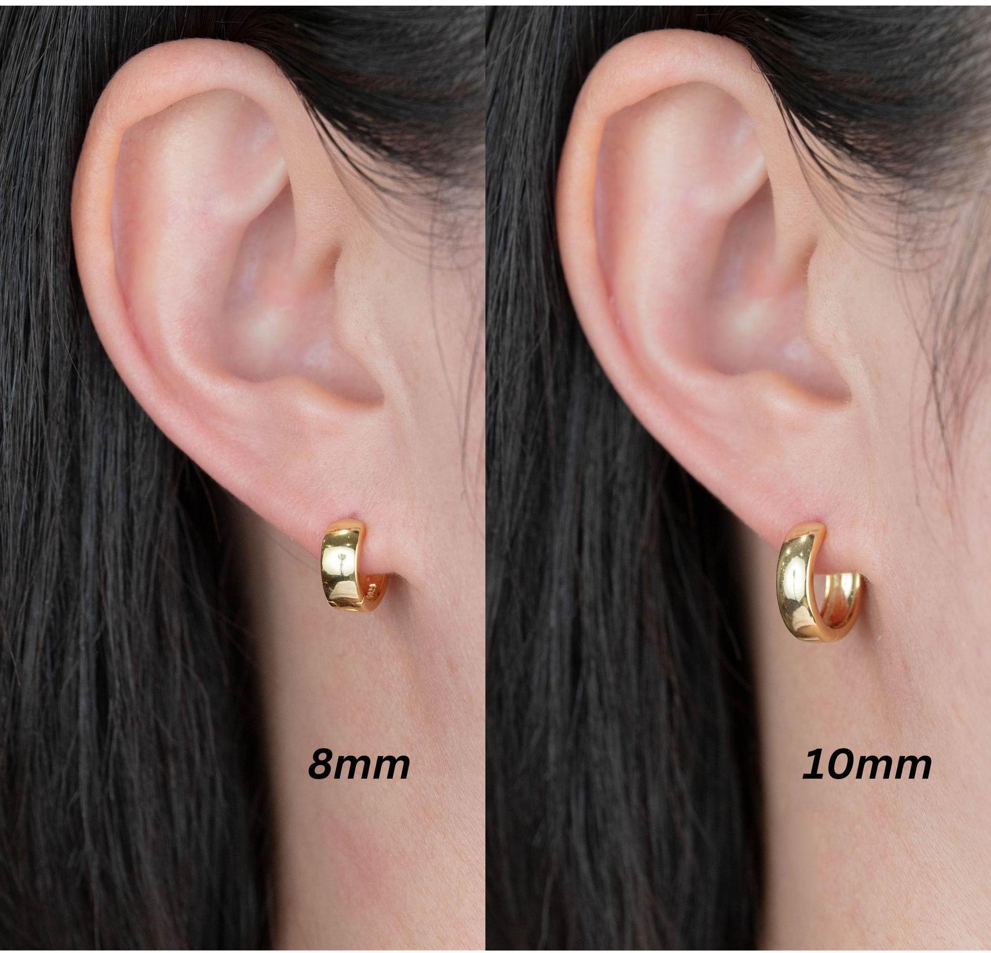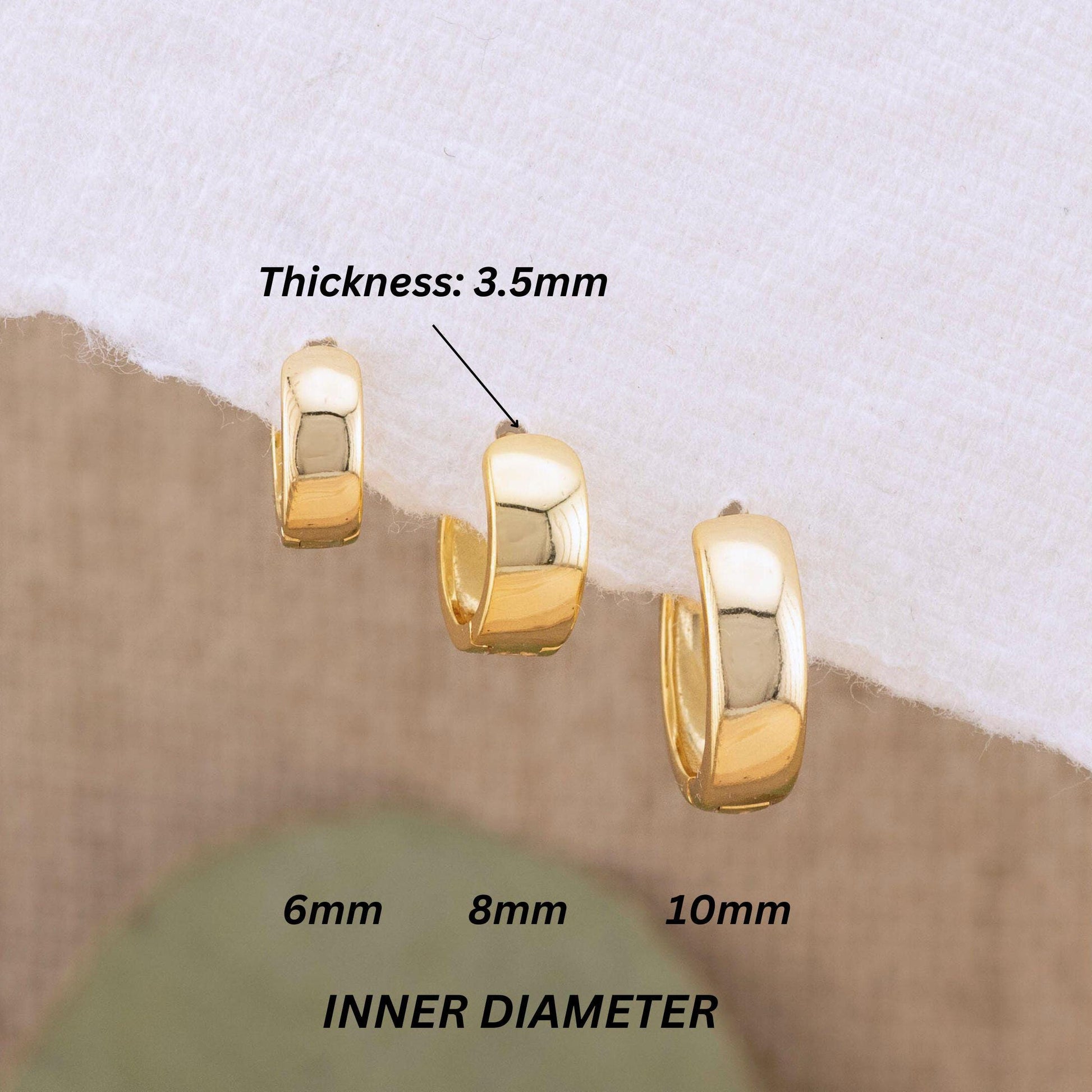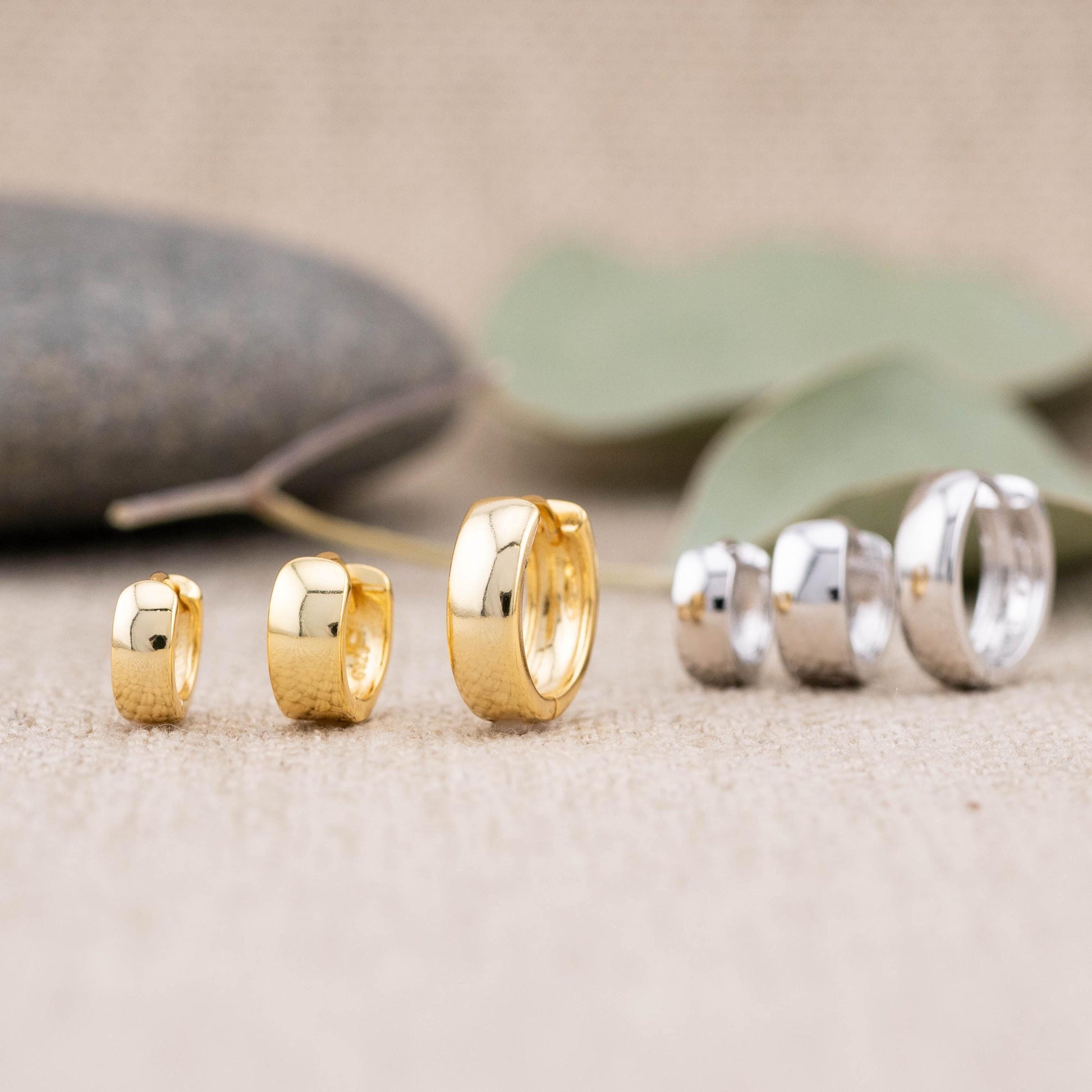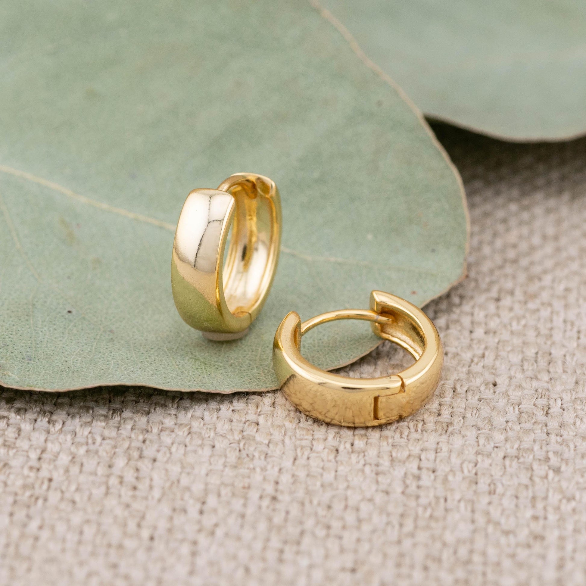 Bold in shape, minimal in size. These wide small huggie hoops add just the right touch of shine to any ear stack. Crafted in 14K gold fill with a secure clicker hinge closure, they’re lightweight, durable, and designed for everyday wear.