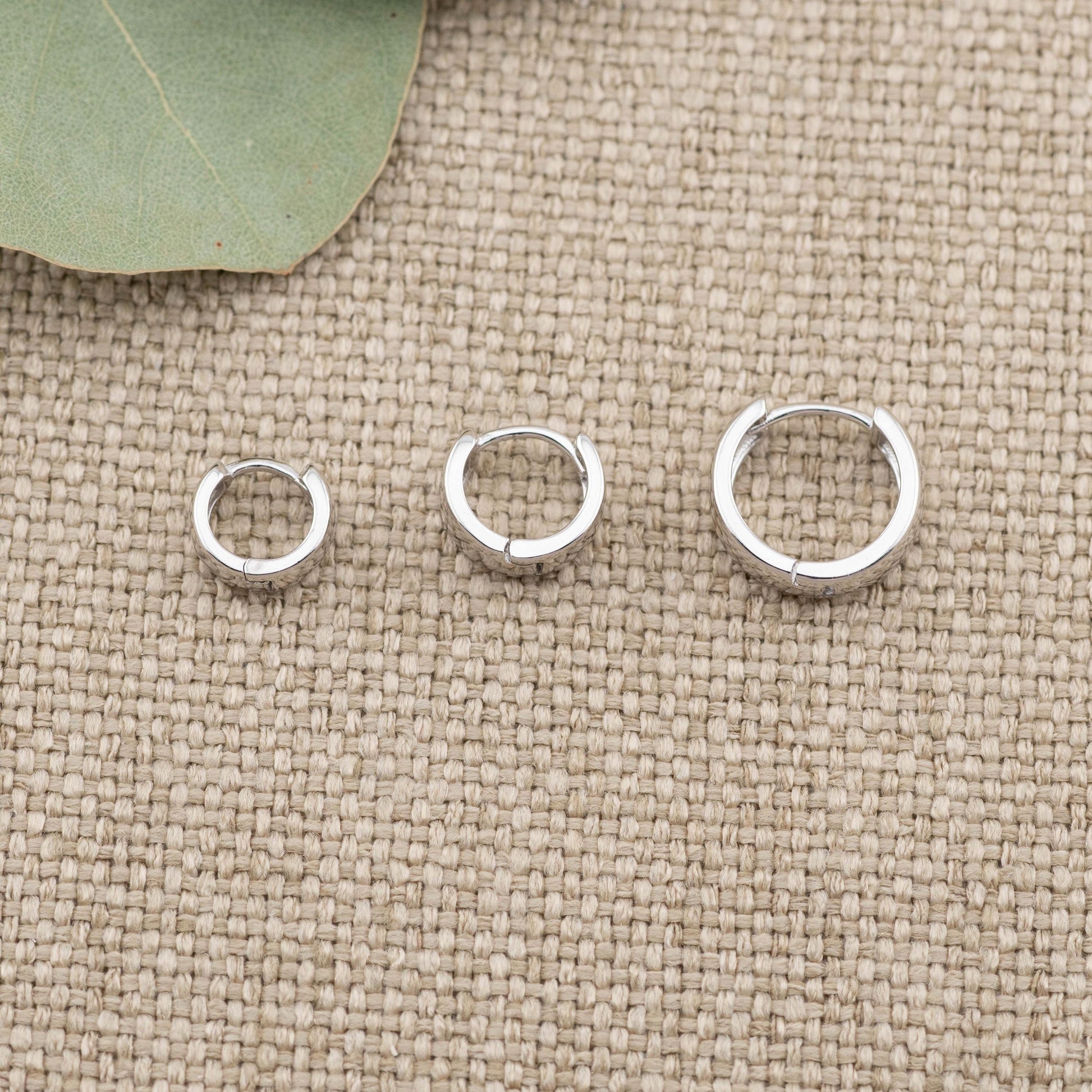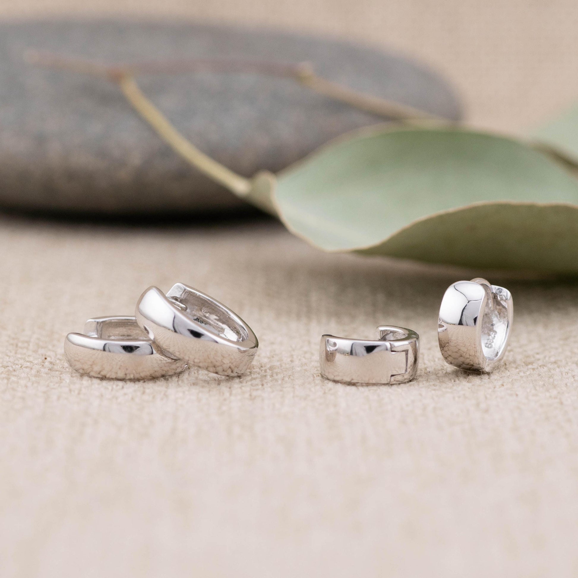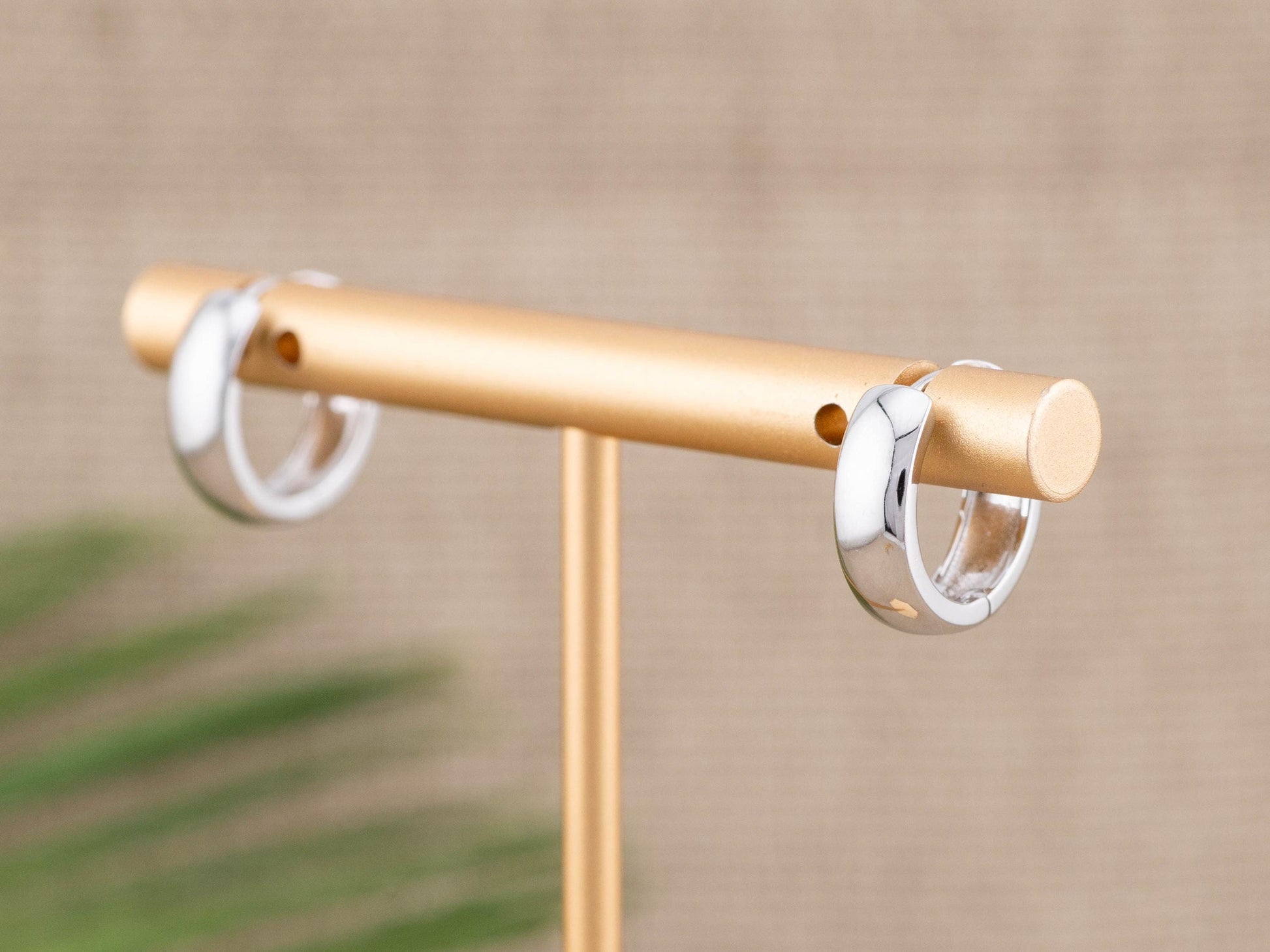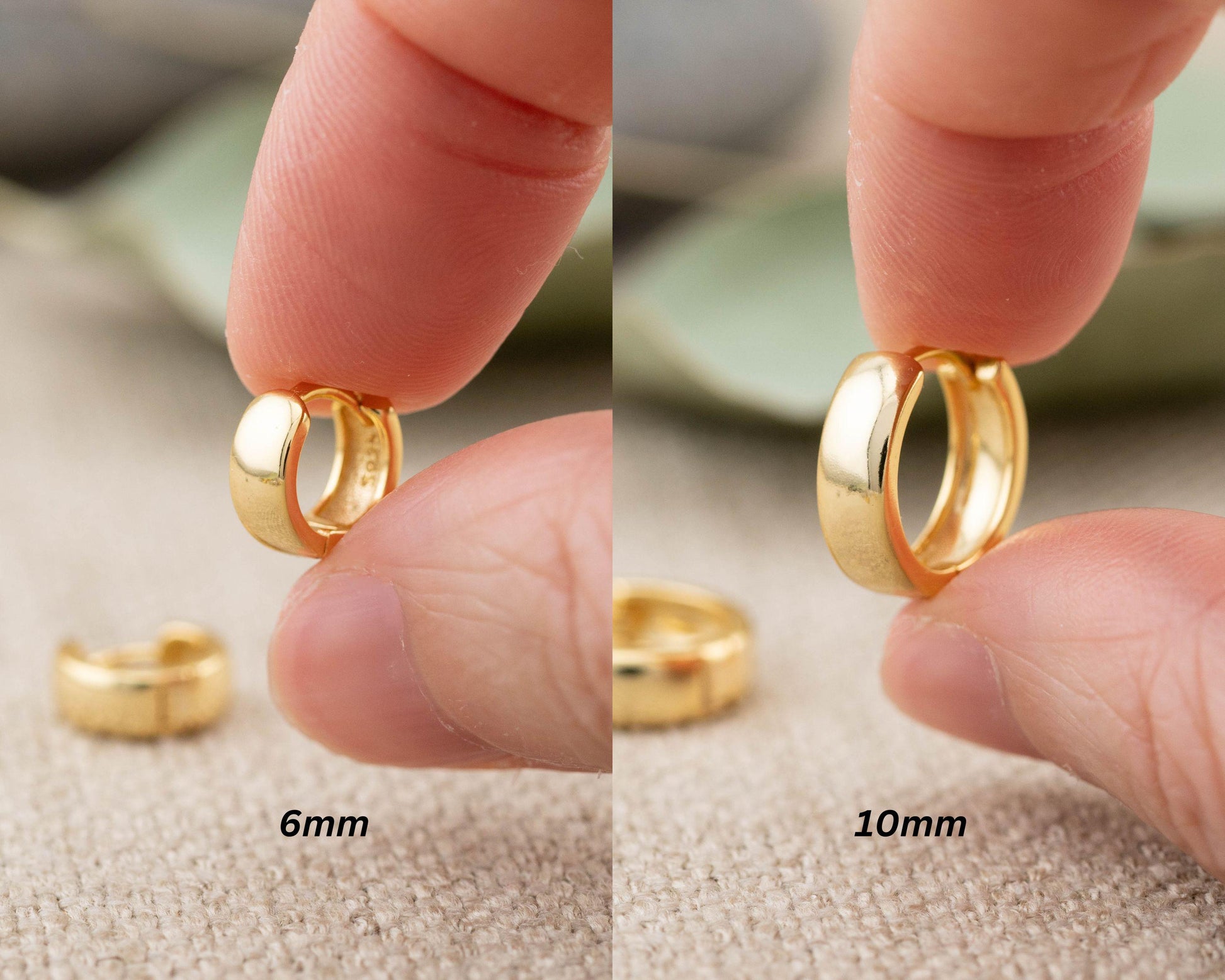 Bold in shape, minimal in size. These wide small huggie hoops add just the right touch of shine to any ear stack. Crafted in 14K gold fill with a secure clicker hinge closure, they’re lightweight, durable, and designed for everyday wear.