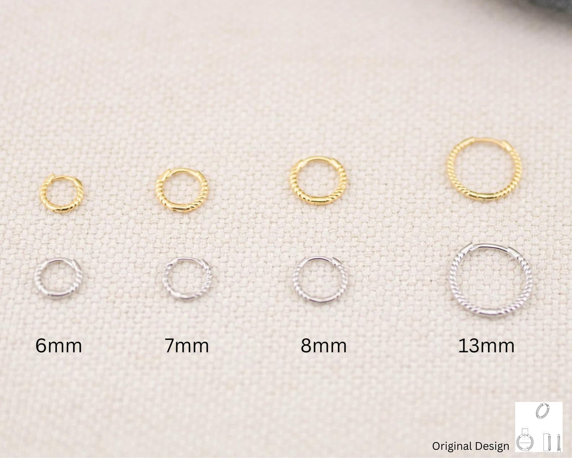 Introducing our minimalist huggie hoops available in 6mm, 7mm, 8mm, 13 mm sold as 2 pairs set or 3 pairs set! They are dainty sleeper hoops for everyday wear, yet their thin braided or croissant shape make them stand out. Made with solid 925 sterling silver , 18 K gold filled (core sterling silver)